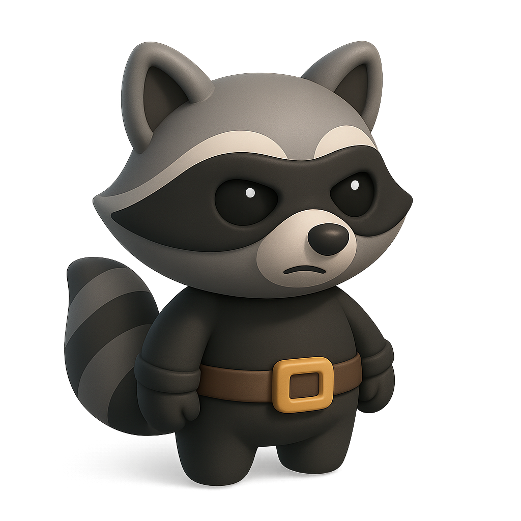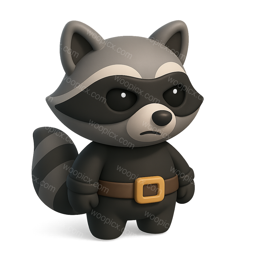 A cute, stylized cartoon raccoon character wearing a mask and belt, perfect for children's illustrations or animated projects.