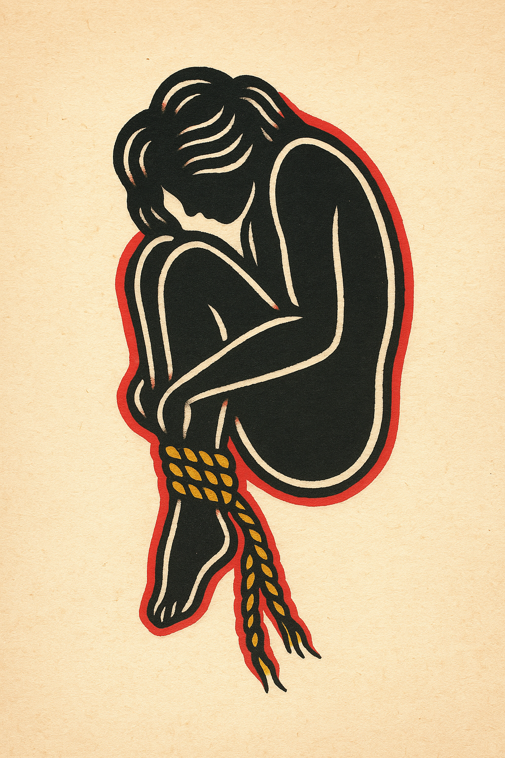 A classic tattoo design featuring a silhouette of a figure with tied legs using rope. The artwork is in multiple colors set against a light beige background.