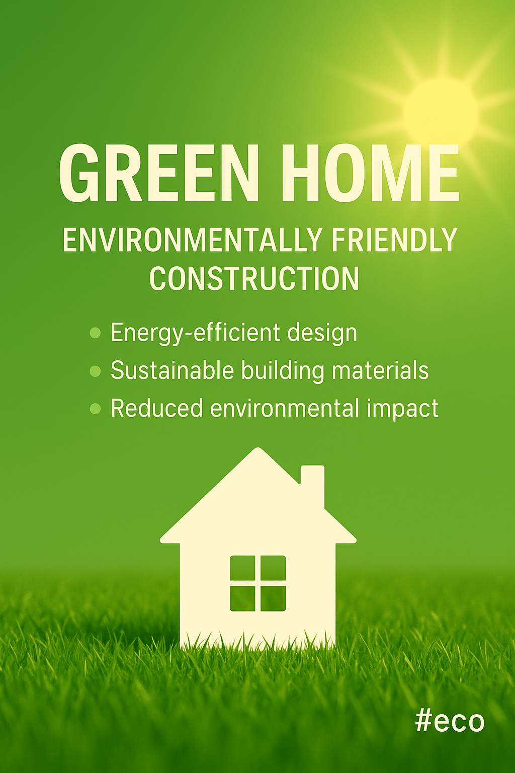 Informative graphic promoting green home construction, featuring eco-friendly design elements and a bright, inviting color scheme intended for environmental awareness campaigns.