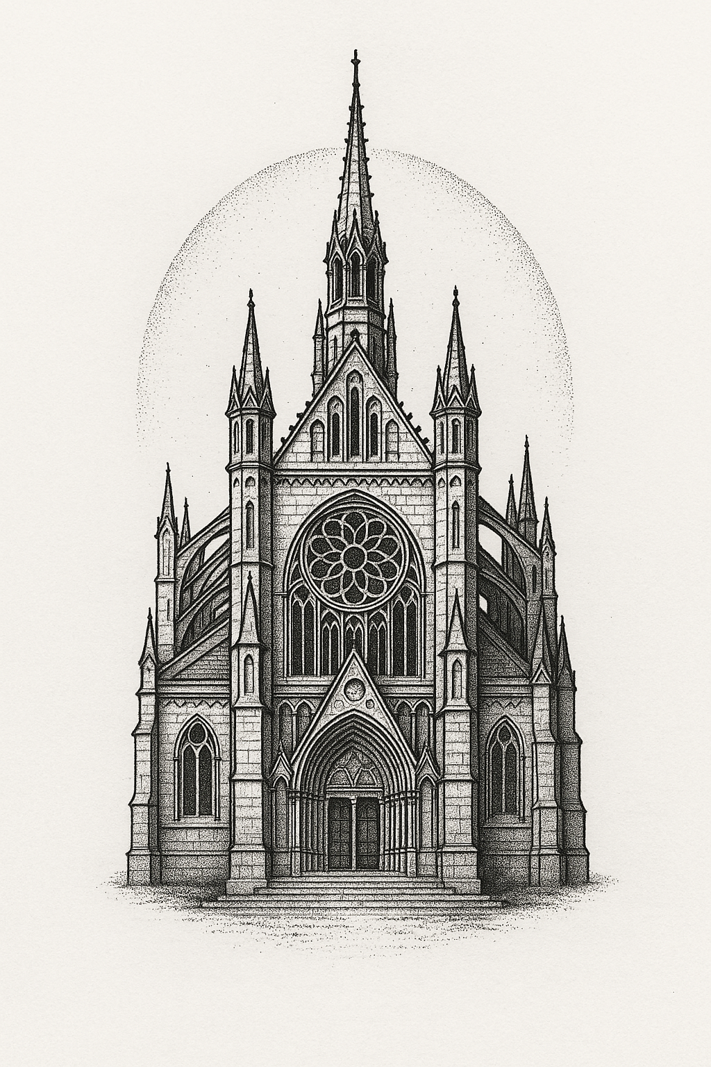 /Collection: /by davooda/Type: PNG/This image features a detailed black-and-white illustration of a gothic cathedral, showcasing intricate architectural elements and design. Ideal for art enthusiasts and architectural studies.