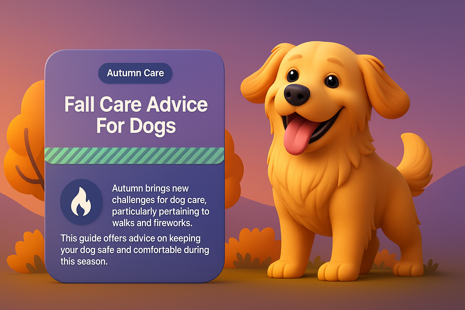/Collection: /by davooda/Type: PNG/A cheerful golden retriever stands beside a block of autumn care advice for dogs, set against a gradient background of soft purple and warm hues, perfect for seasonal guidance.