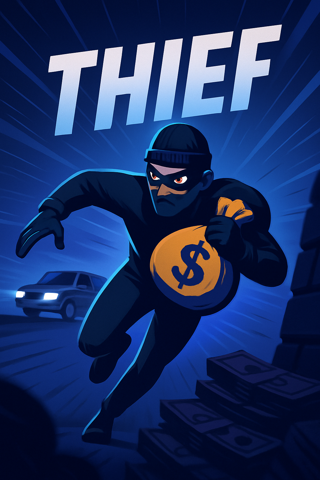 An energetic portrayal of a thief in action, showcasing a dramatic gradient background. The figure carries a bag of money, emphasizing movement and urgency with a bold title.