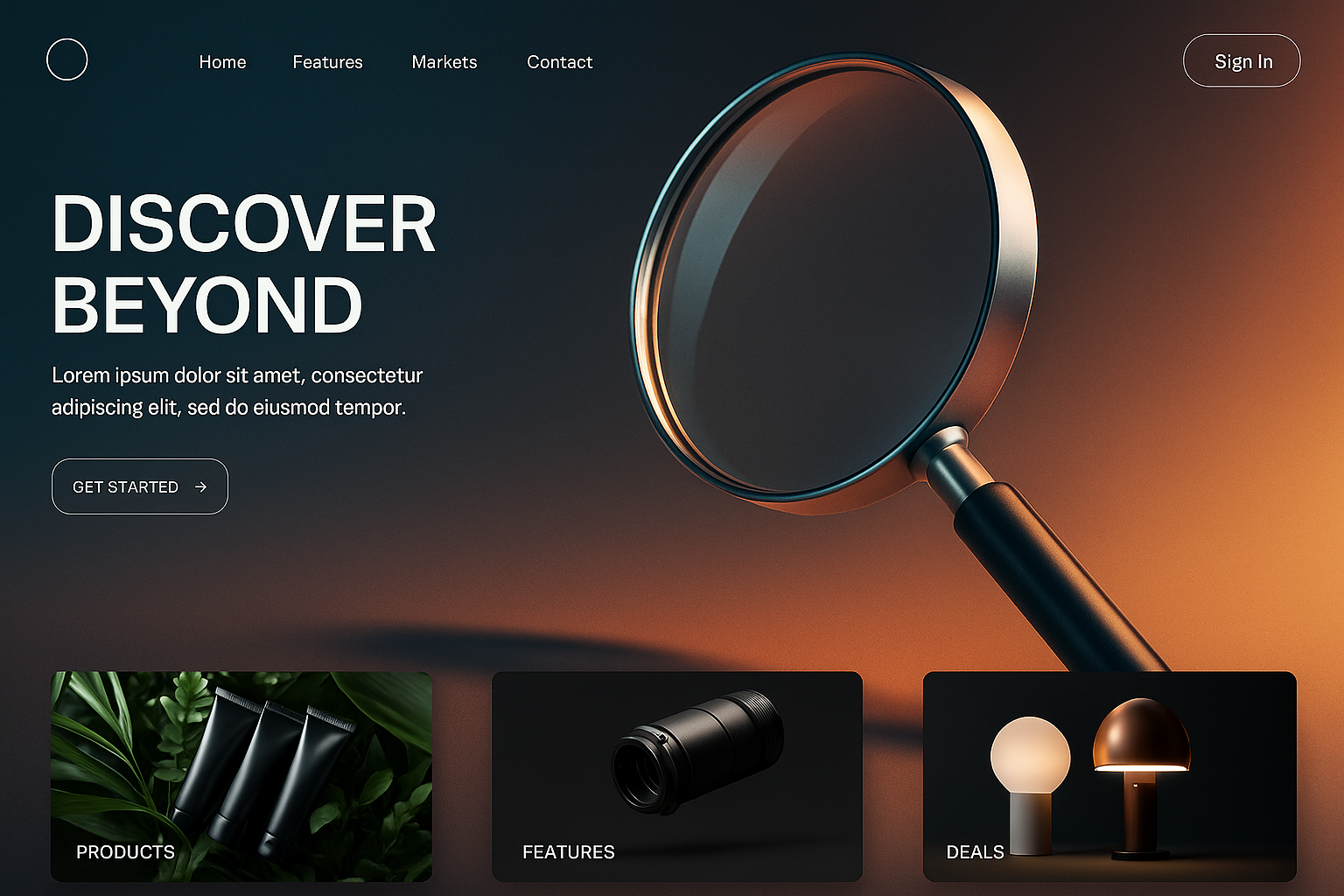 /Collection: /by davooda/Type: PNG/A visually striking landing page featuring a realistic magnifying glass, small sans-serif typography, and dynamic gradient background. The layout includes sections for products and deals.
