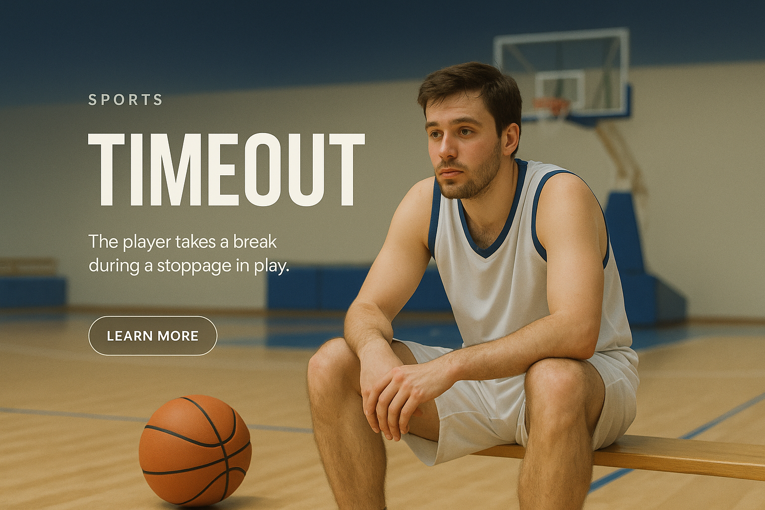 /Collection: /by davooda/Type: PNG/A stylish web page design featuring a basketball player taking a timeout. The layout includes a headline, descriptive text, and a call-to-action button. The design utilizes a two-color gradient background for a modern look.