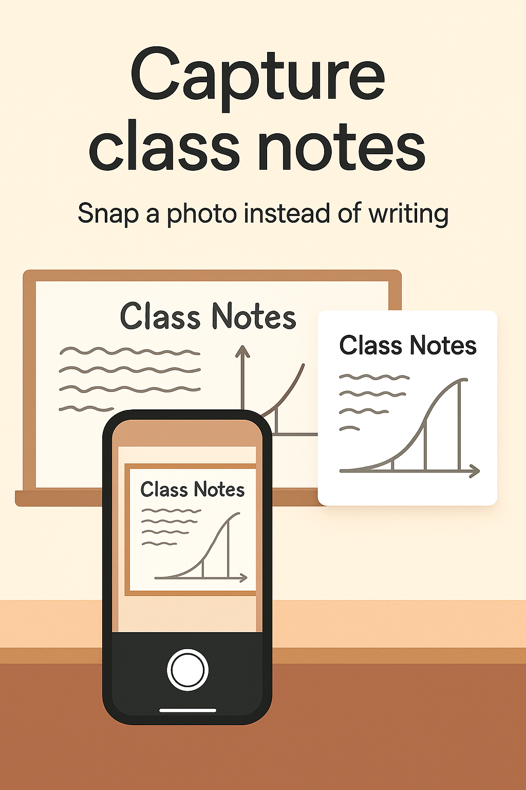 /Collection: /by davooda/Type: PNG/Illustrative graphic promoting the use of mobile technology for capturing class notes. Features smartphone and whiteboard visuals with a clean, modern design ideal for educational apps.