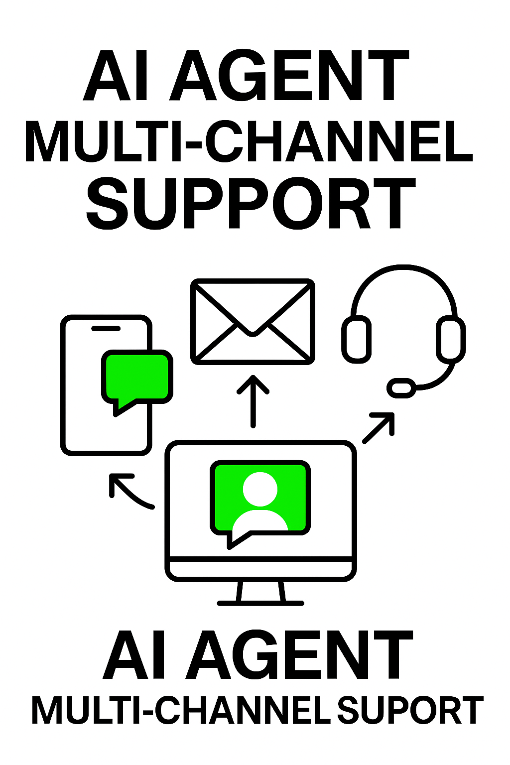 /Collection: /by davooda/Type: PNG/Modern graphic illustrating the concept of AI agent support across multiple channels, including phone, email, and chat. Suitable for tech or customer service marketing.