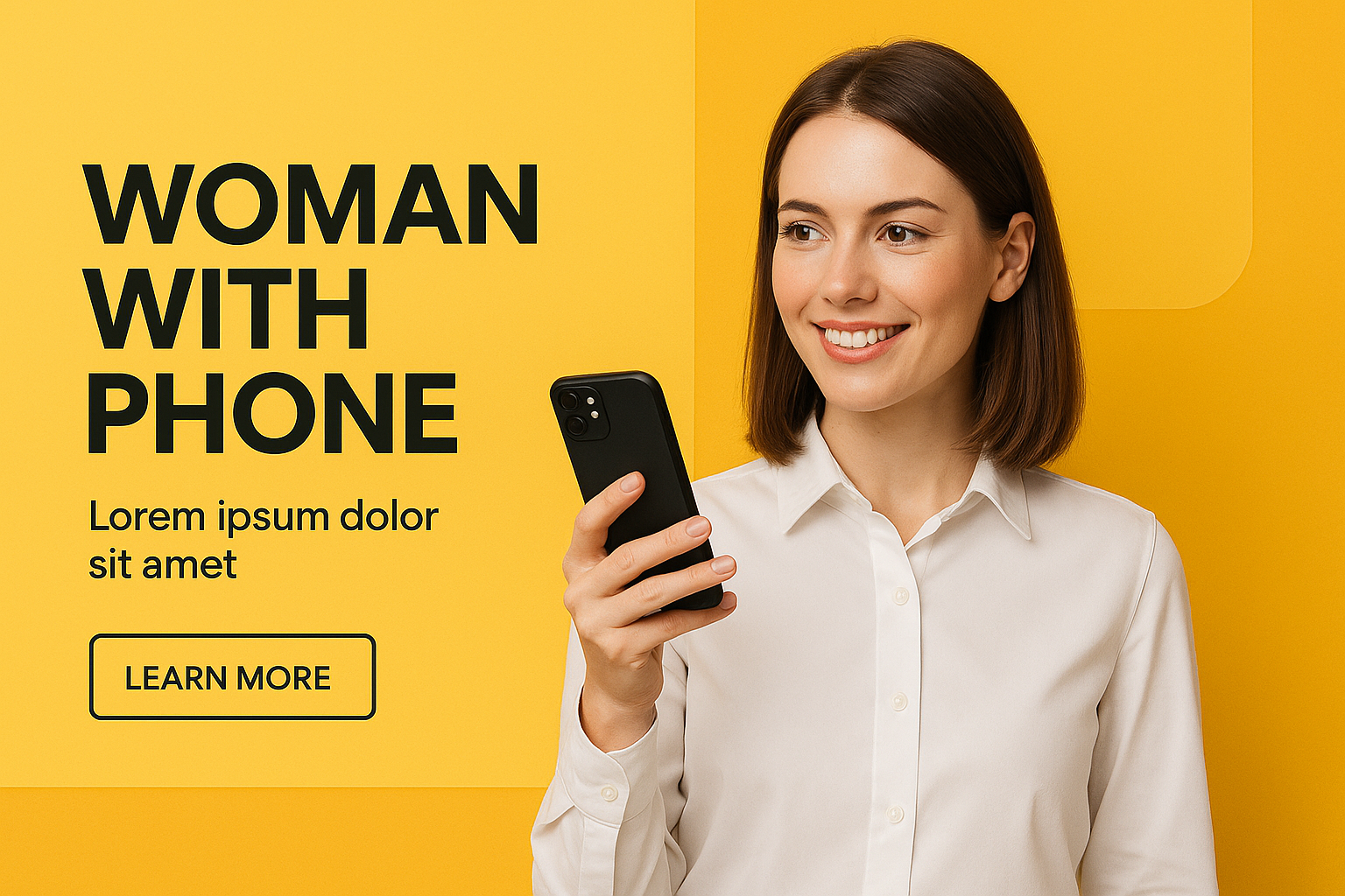 /Collection: /by davooda/Type: PNG/A well-composed image of a woman holding a phone against a bright yellow background. The layout features bold typography and a clear call-to-action button, emphasizing modern corporate aesthetics.