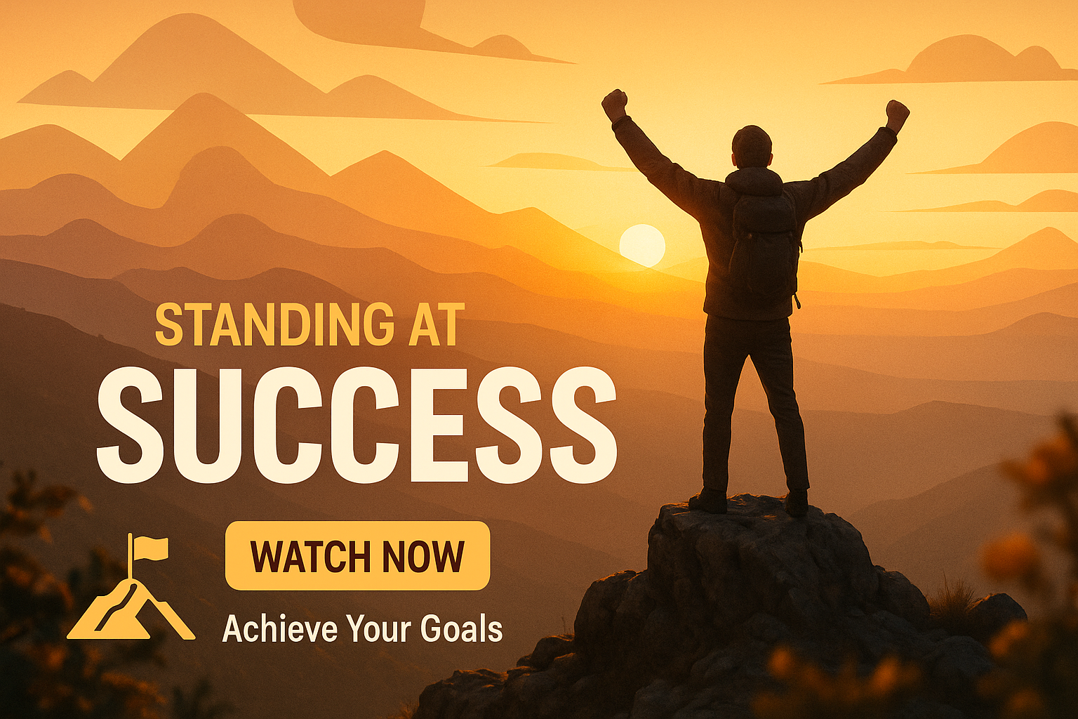 /Collection: /by davooda/Type: PNG/A visually striking motivational graphic featuring a silhouette of a person celebrating atop a mountain at sunset, ideal for personal development or achievement themes.