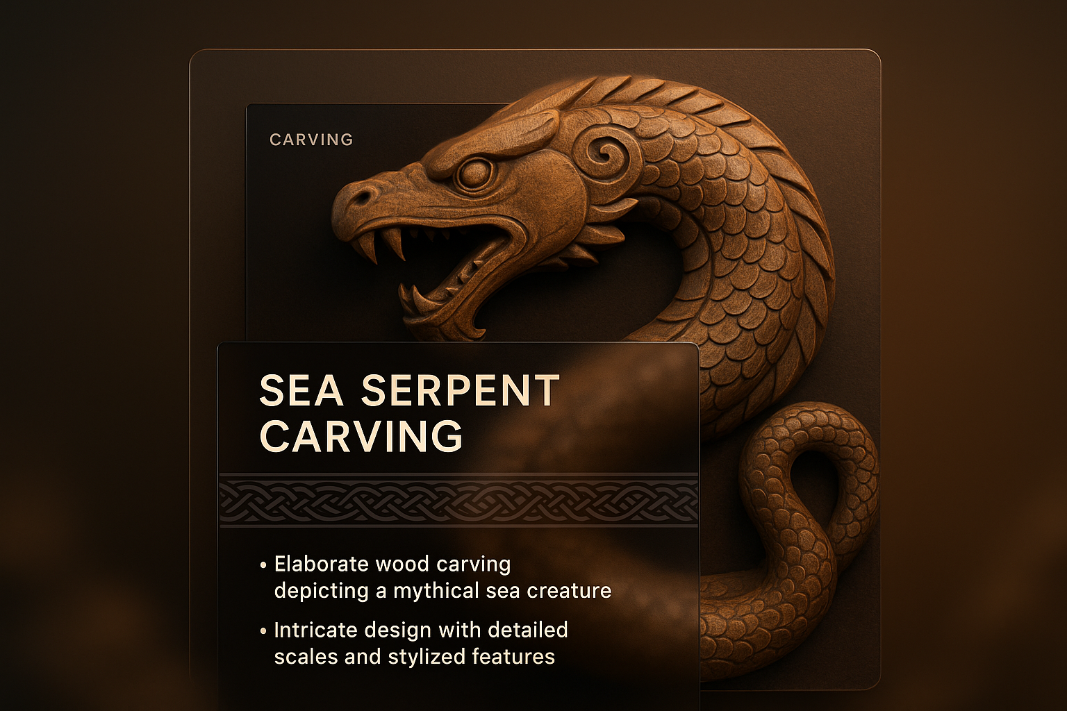 A detailed wood carving of a mythical sea serpent, showcasing intricate scales and stylized features. The design includes a dark overlay for enhanced visual appeal.