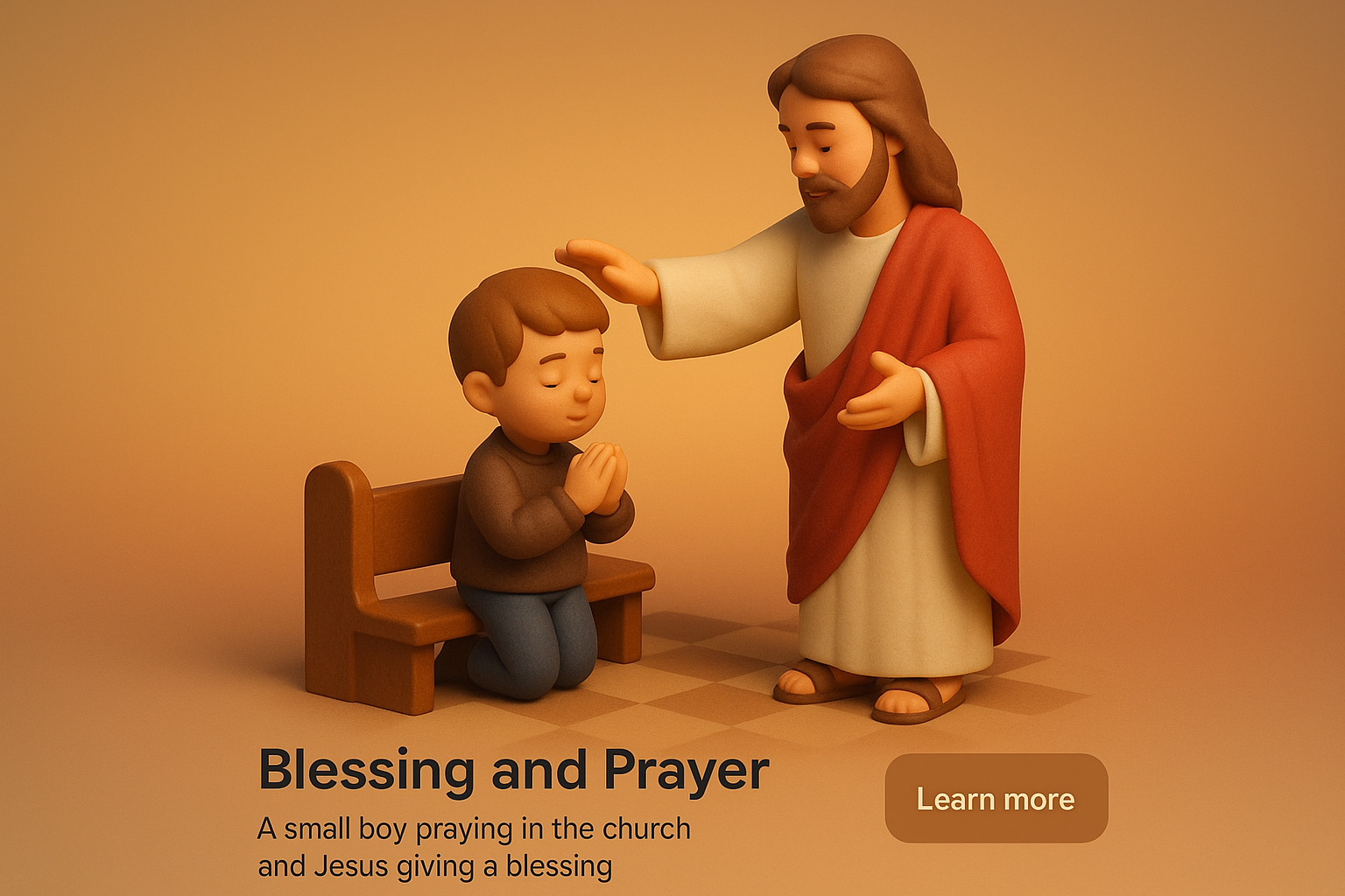 A small boy kneels in prayer in a church, while Jesus blesses him, creating a warm and serene atmosphere. The scene features a smooth gradient background and detailed 3D elements.