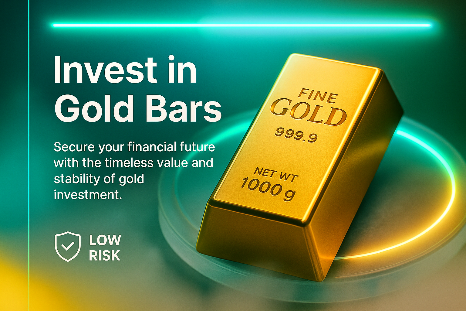 A visually striking carousel slide promoting gold bars as an investment. The design features a glowing gold bar with a neon backdrop, emphasizing security and stability.