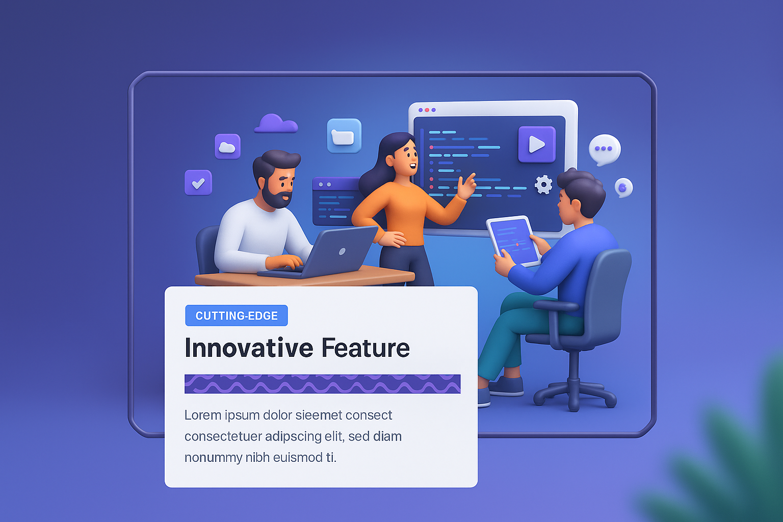 /Collection: /by davooda/Type: PNG/A vibrant illustration of a software development team engaged in coding and collaboration. The scene features a modern workspace with developers interacting over laptops and tablets, emphasizing teamwork and innovation.