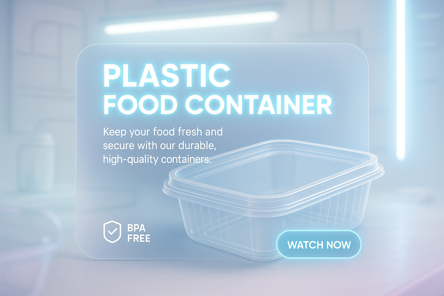 Modern promotional graphic highlighting BPA-free plastic food containers with a sleek design, perfect for online marketing and product showcases.