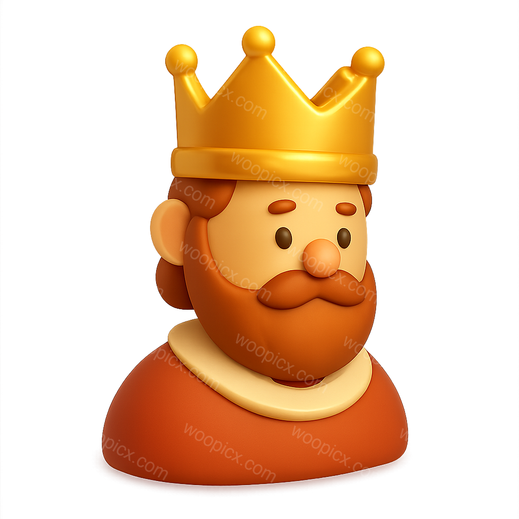 A stylized 3D icon of a king wearing a golden crown, showcasing a three-quarter view. The character has a friendly expression, with a beard and simple features, set against a soft gradient background.