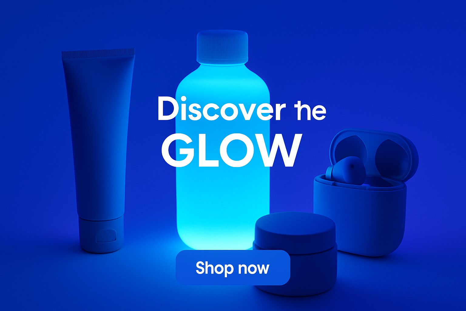 /Collection: /by davooda/Type: PNG/The image features a glowing blue bottle surrounded by skincare products and earbuds. The scene is illuminated with a striking fluorescent light, casting a vibrant blue and violet atmosphere.