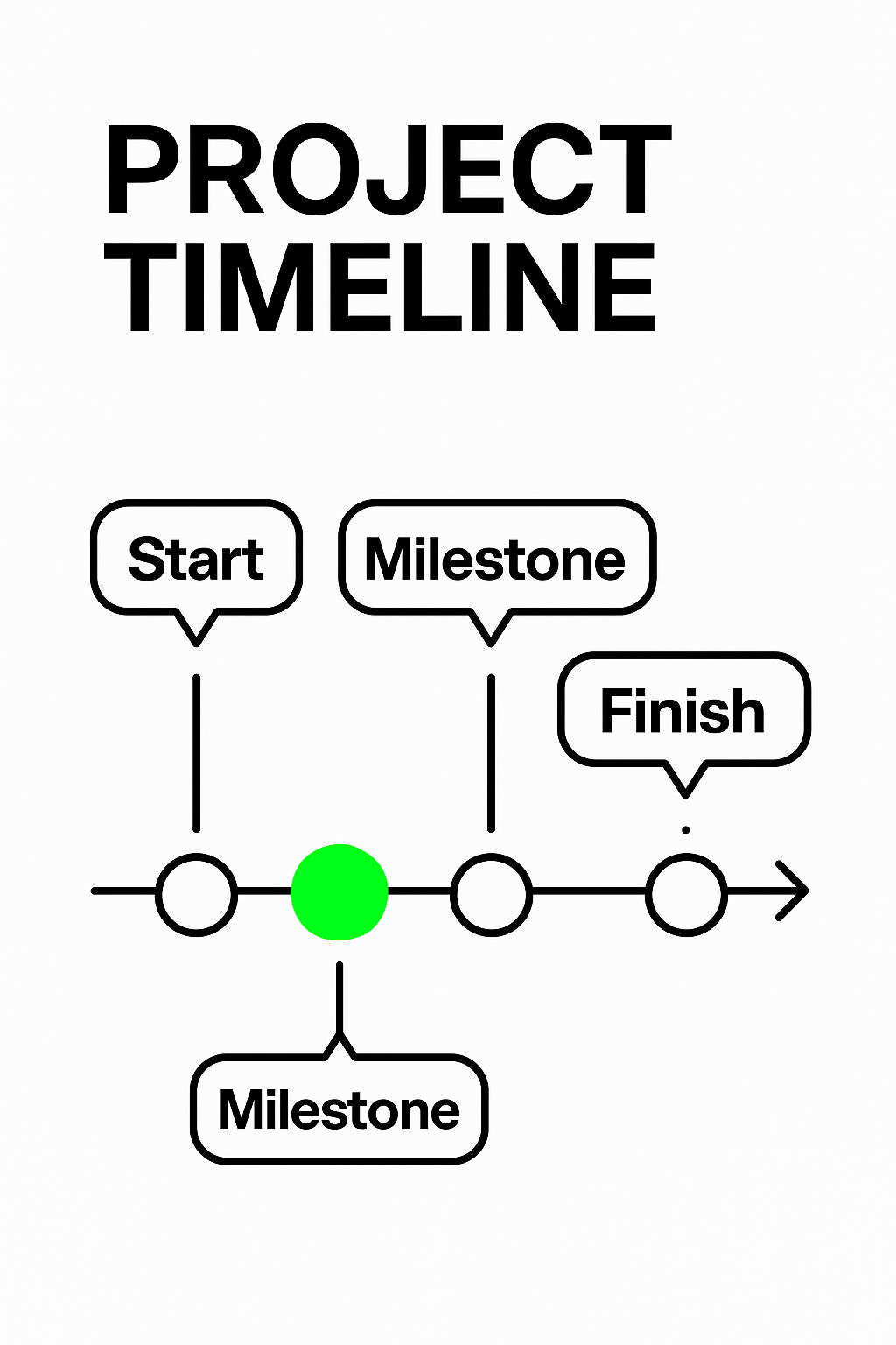 Minimalistic project timeline infographic illustrating key phases from start to finish, ideal for project management presentations and planning.