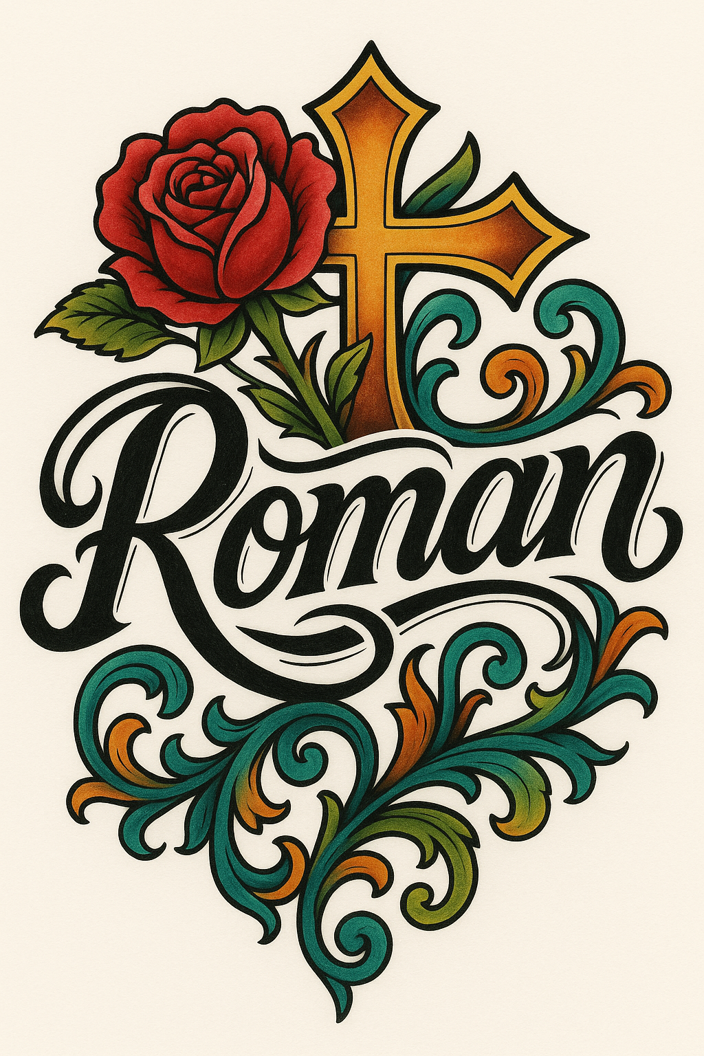 Intricate tattoo design combining a rose and cross with ornate lettering, showcasing vibrant colors and elaborate detailing, ideal for tattoo enthusiasts and artists.