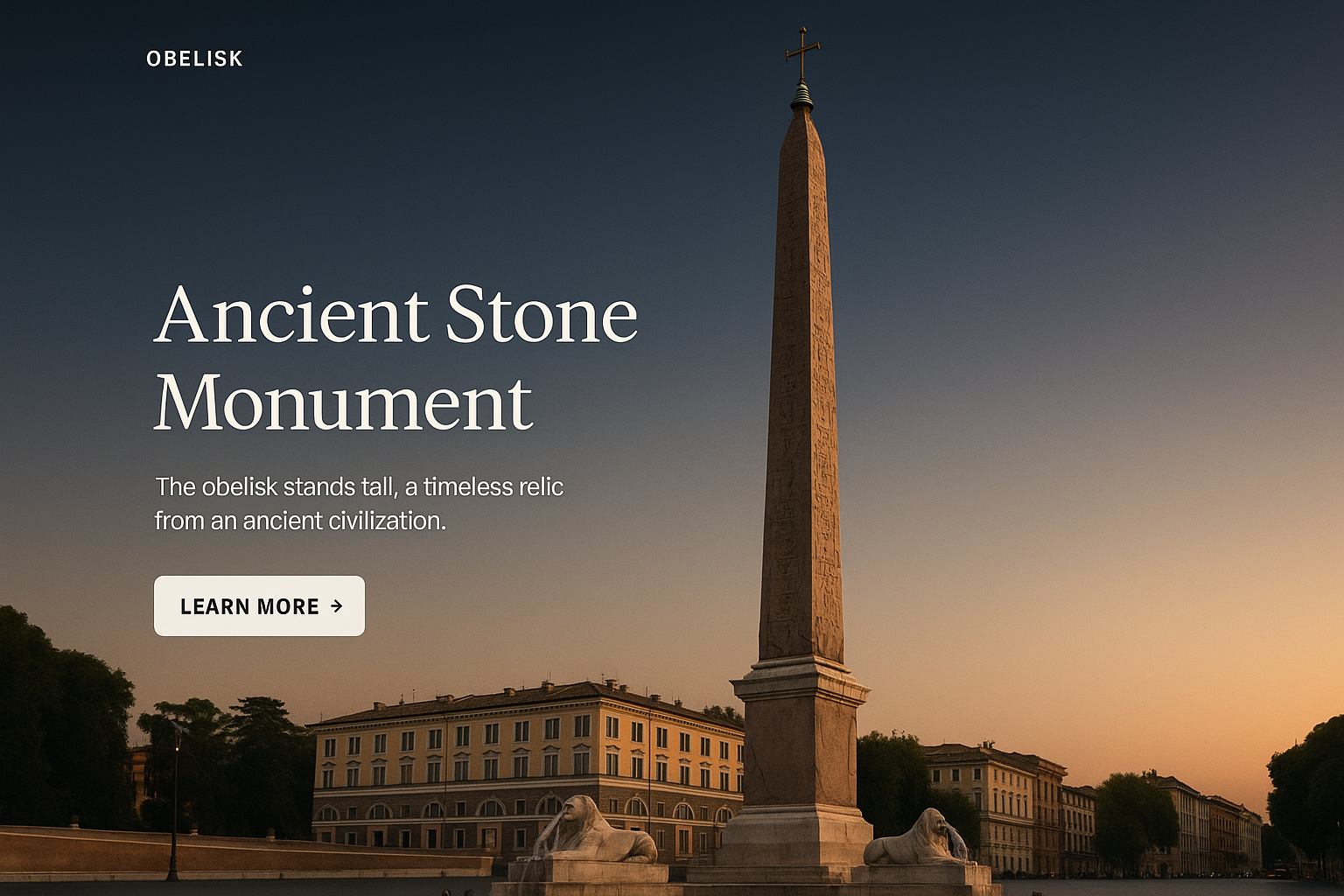 /Collection: /by davooda/Type: PNG/A stylish web page design featuring an ancient stone obelisk. The layout includes a gradient background, a prominent title, and a descriptive text block with a call-to-action button.