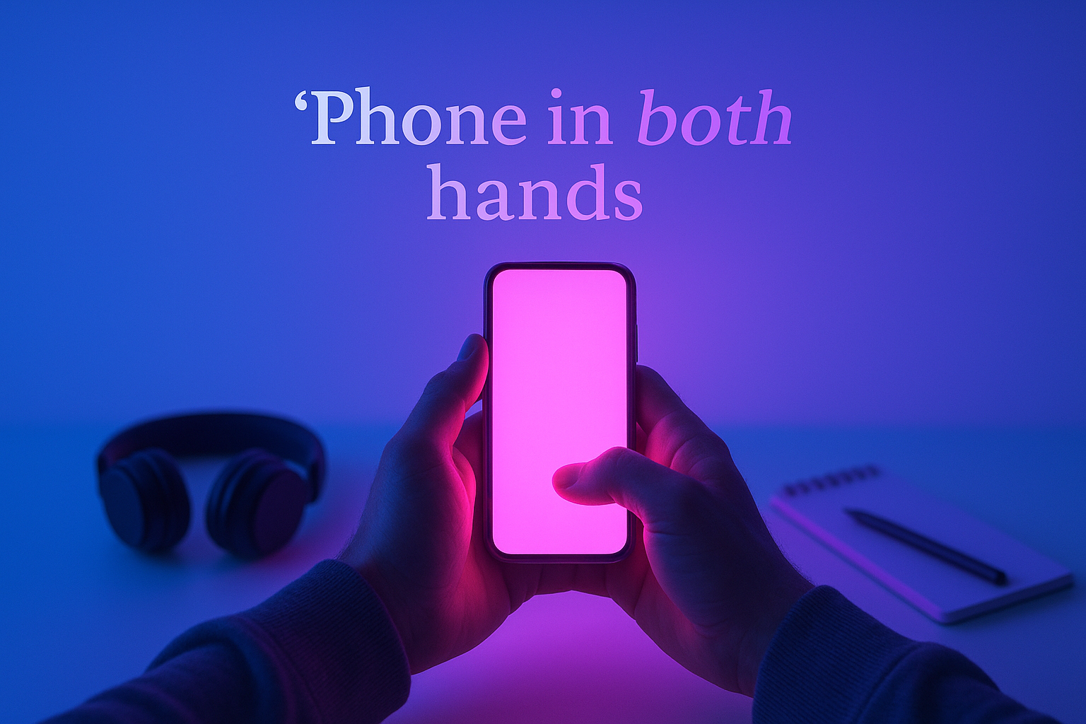 A pair of hands holding a phone emitting a vibrant neon pink glow, set against a solid blue background. The glow illuminates the surrounding space with cool shades.