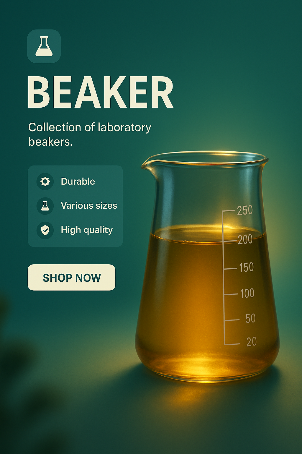This is a promotional graphic showcasing a laboratory beaker with a modern design. The image uses soft lighting and a gradient background, ideal for e-commerce.