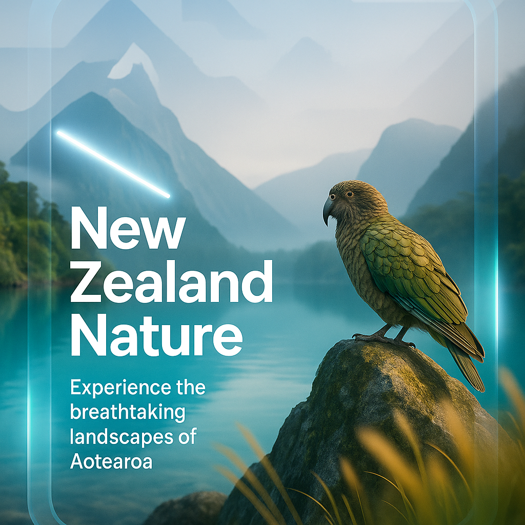 /Collection: /by davooda/Type: PNG/Visually striking promotional image showcasing New Zealand's natural beauty with a vibrant parrot and serene landscape. Ideal for tourism marketing and travel-related content.