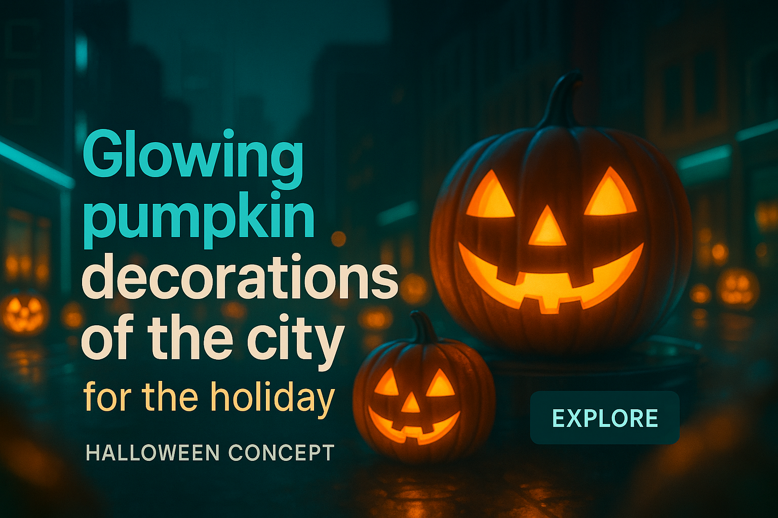 /Collection: /by davooda/Type: PNG/A vibrant Halloween-themed graphic showcasing glowing pumpkin decorations in a city setting, designed for festive promotional use. The atmospheric lighting adds a magical touch.