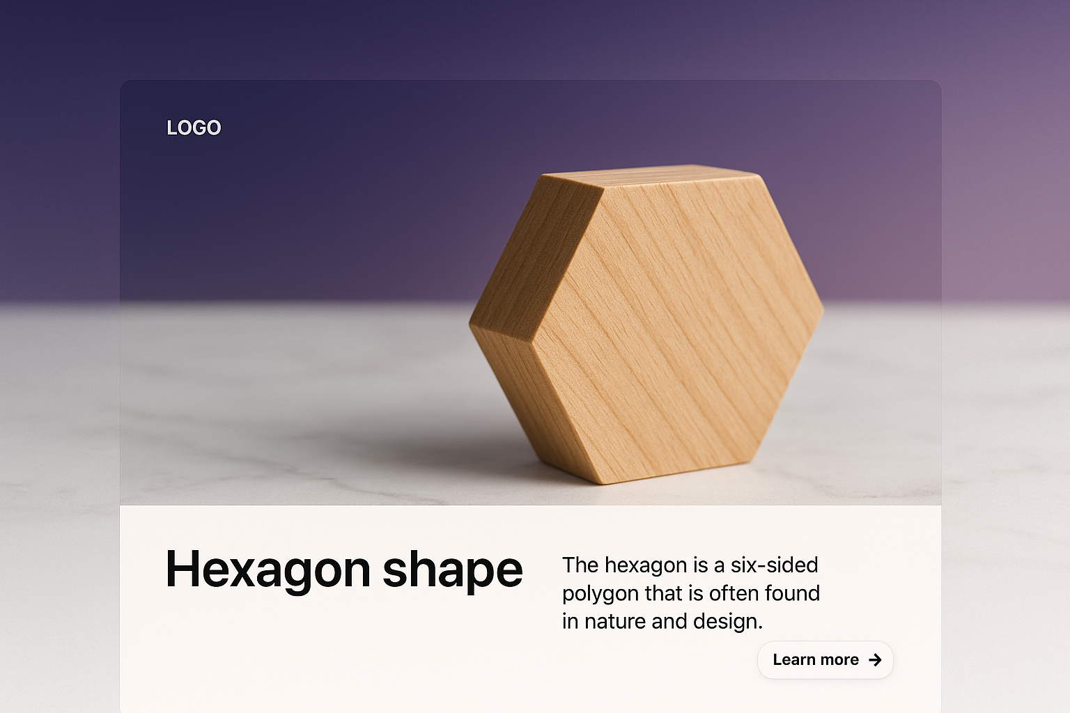 A modern web design layout showcasing a wooden hexagon on a gradient background. Includes a logo placeholder, a brief title, and a text block with a call-to-action button.