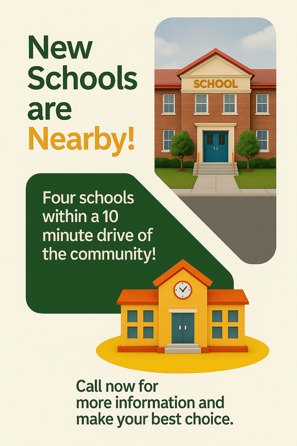 Informative promotional graphic featuring a 3D-rendered school building and a call to action. Ideal for community outreach or real estate marketing.