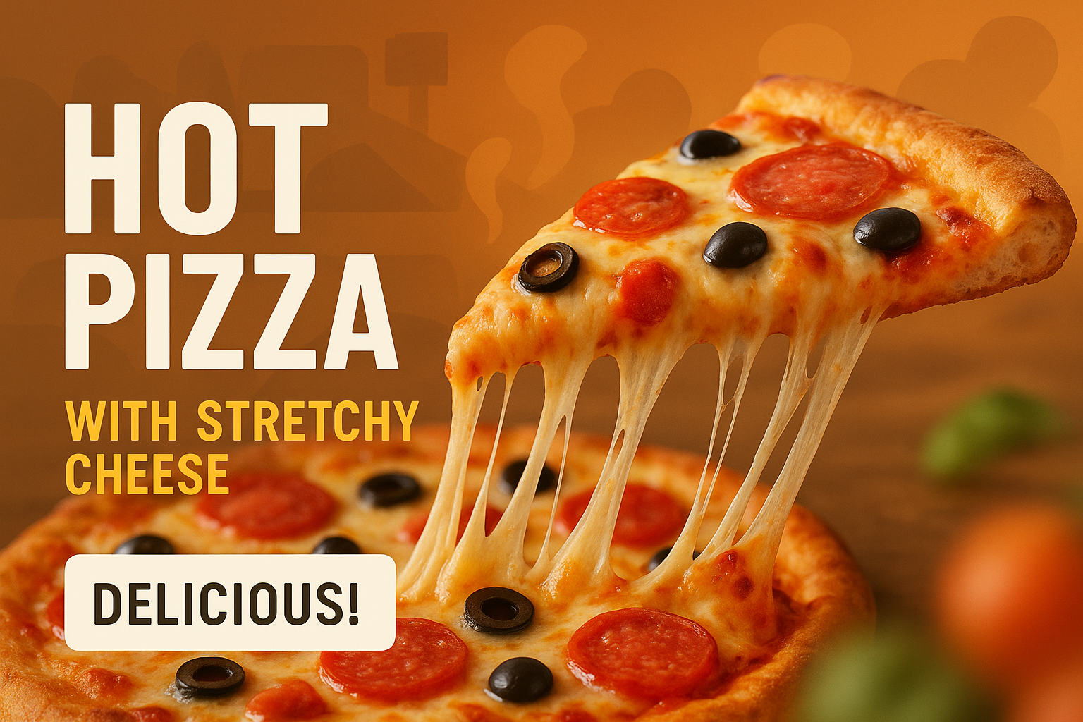 Delicious Pizza Promotional Graphic with Stretchy Cheese