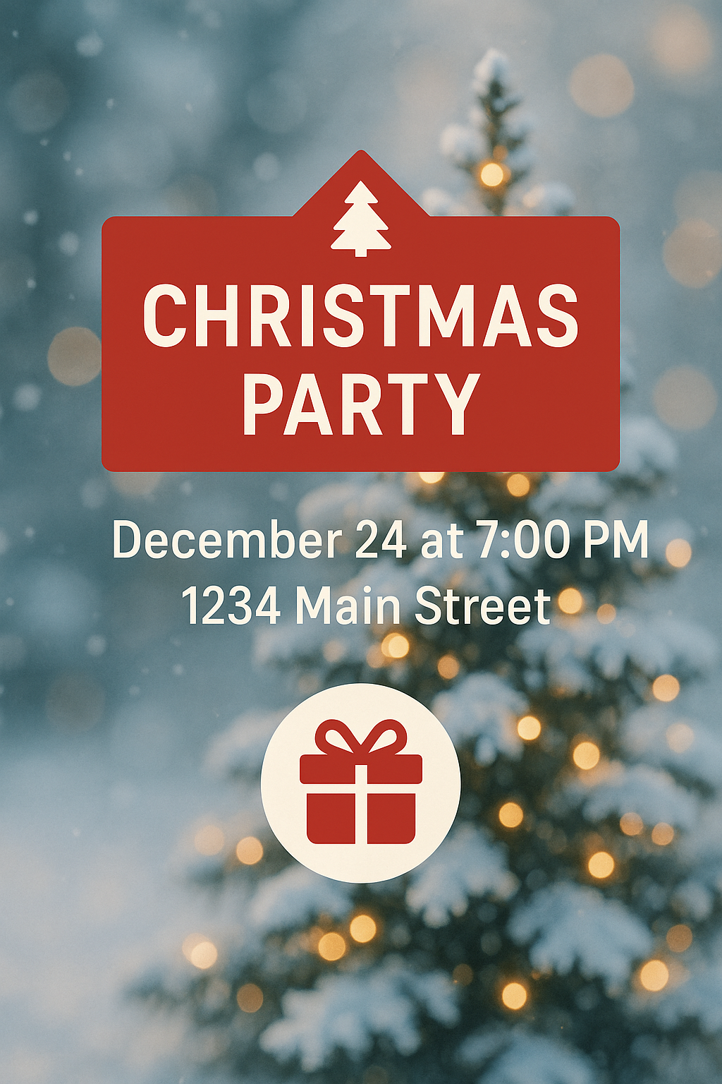 Colorful Christmas party invitation graphic featuring a festive design with a tree and decorative elements, suitable for holiday event promotions.