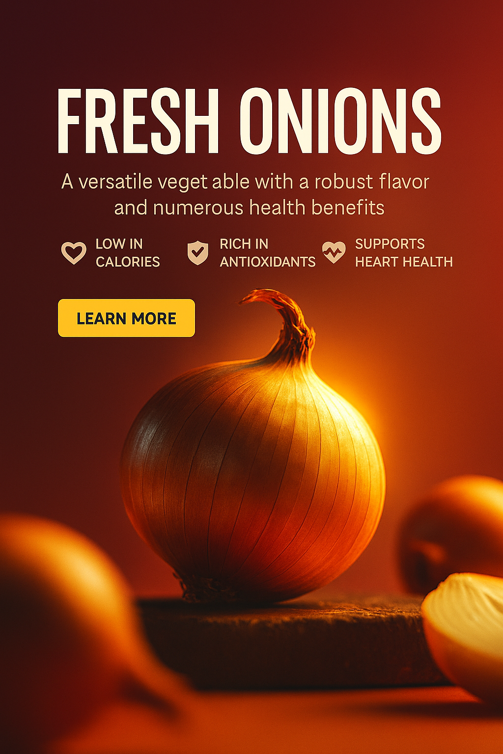 A stunning realistic depiction of fresh onions with a vibrant backdrop, highlighting their health benefits through engaging text and a dynamic composition.