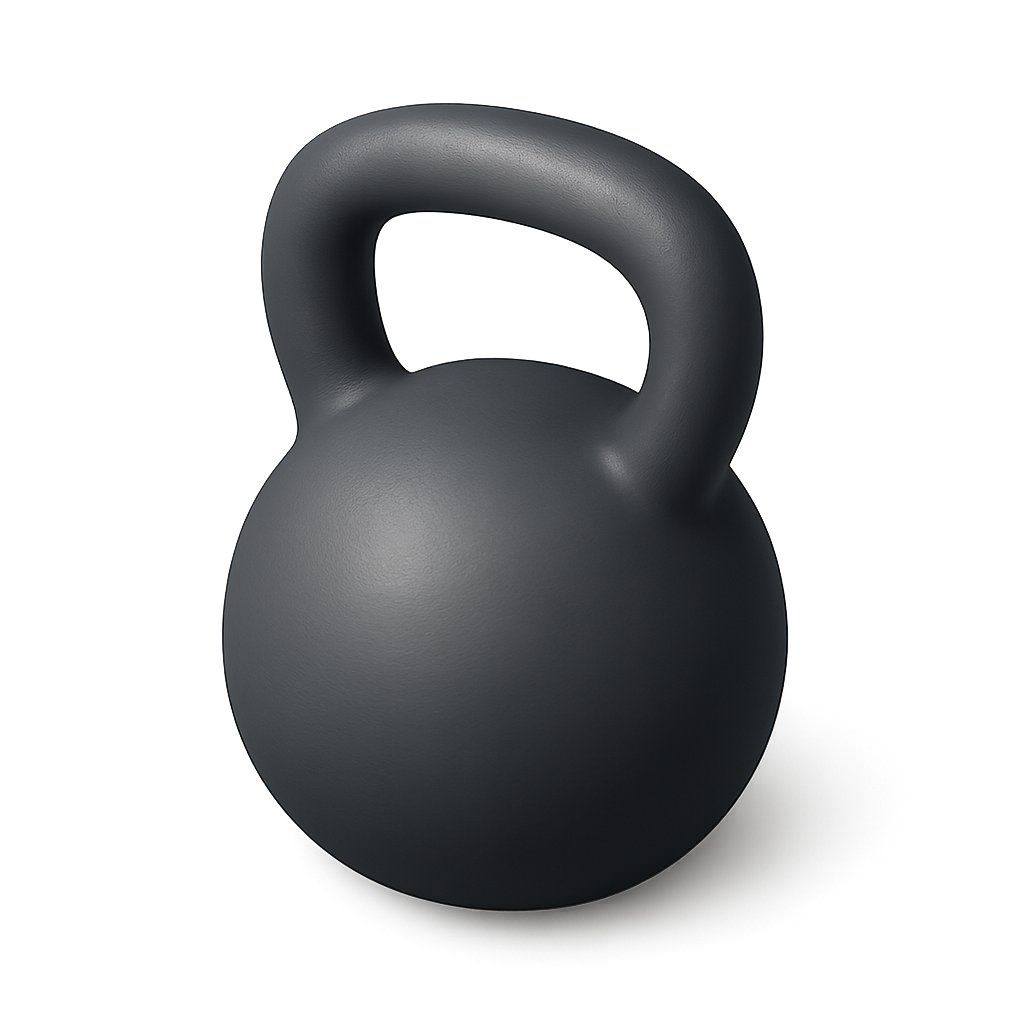 A sleek 3D icon of a kettlebell designed for weightlifting, shown in a three-quarter view with a smooth, volumetric appearance against a transparent background.