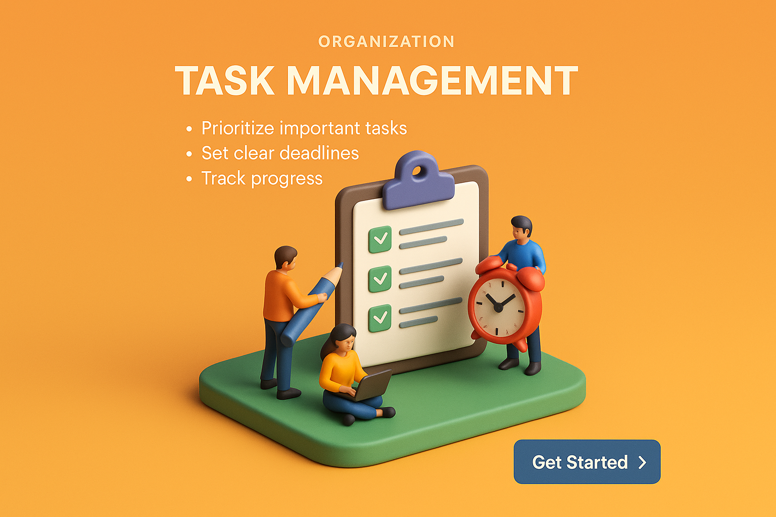 A vibrant 3D illustration showcasing a task management theme. Small figures engage with a checklist and timer, emphasizing organization and productivity.