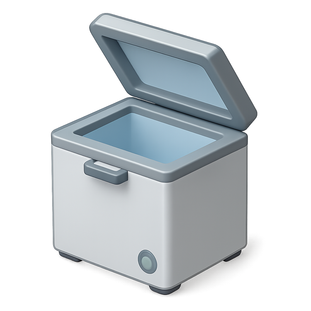 A detailed 3D icon of an open freezer viewed from a three-quarter angle, featuring a clean, isometric design and a transparent background.