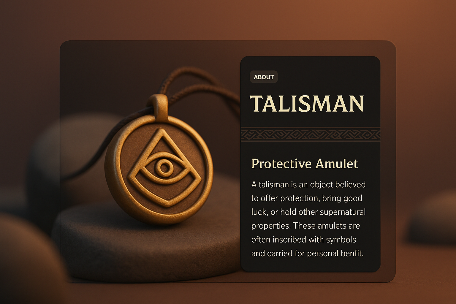 /Collection: /by davooda/Type: PNG/A detailed 3D illustration of a protective talisman pendant, displayed with a dark overlay containing descriptive text about its significance. The design integrates smoothly with the background.