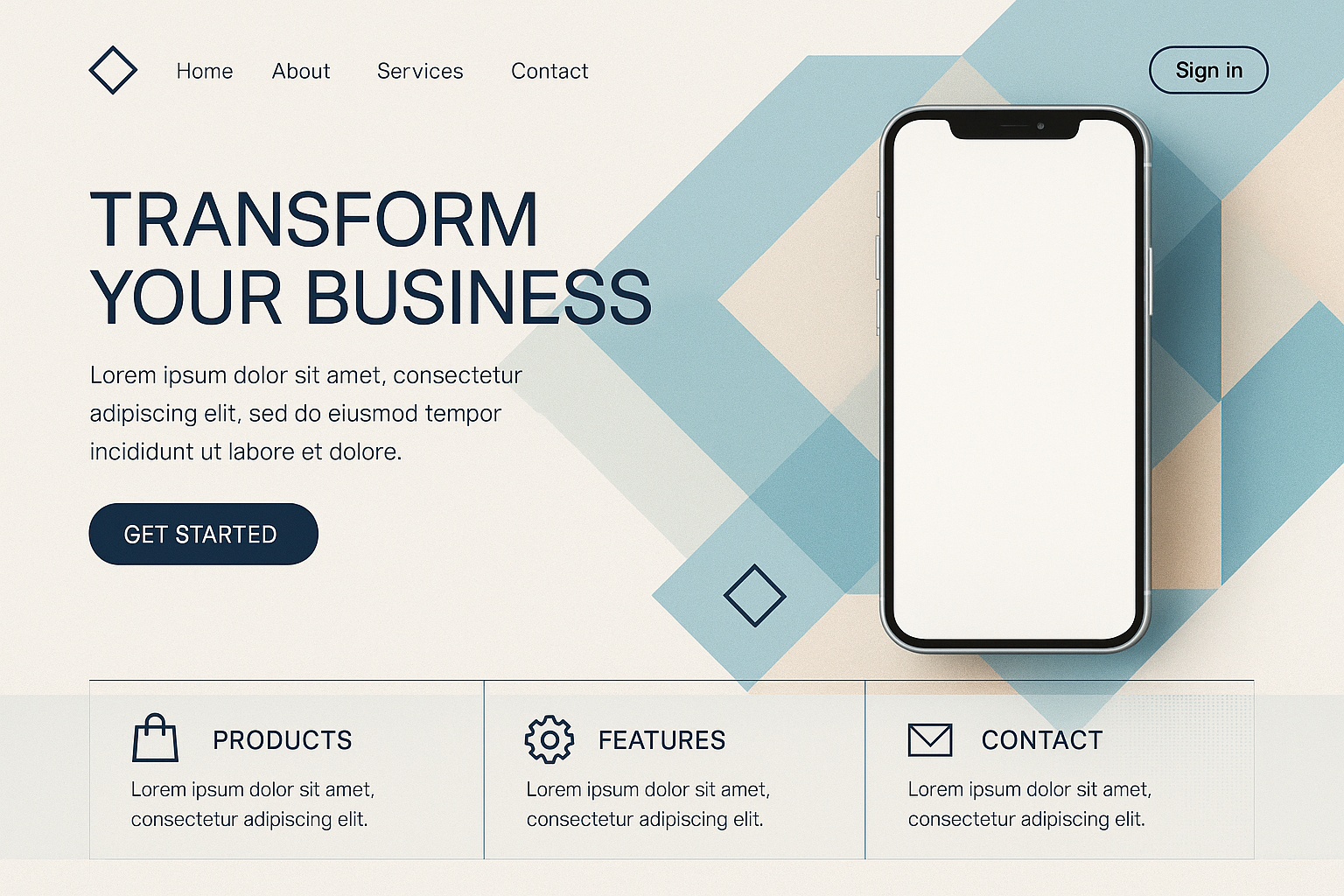 A sleek landing page featuring a smartphone mockup, geometric patterns, and a clean layout. The design includes a call-to-action button and sections for products and features.