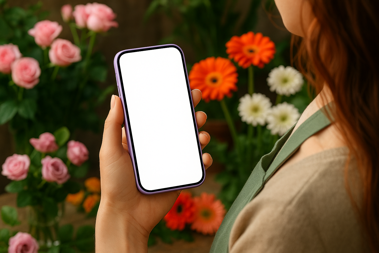 /Collection: /by davooda/Type: PNG/A florist stands among colorful flowers, holding a purple phone with a blank screen. The scene captures the vibrant hues of roses and gerbera daisies, creating a lively atmosphere.