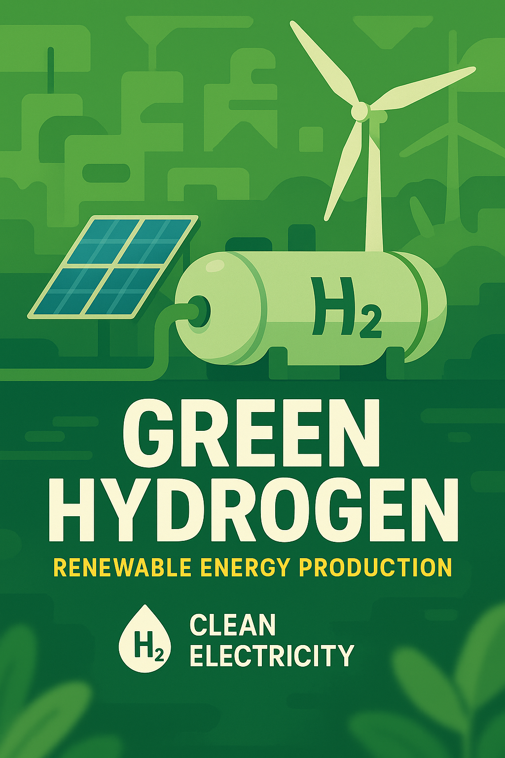 /Collection: /by davooda/Type: PNG/A vibrant graphic illustrating the concept of green hydrogen production, featuring renewable energy sources like wind and solar. Ideal for educational purposes and environmental awareness campaigns.