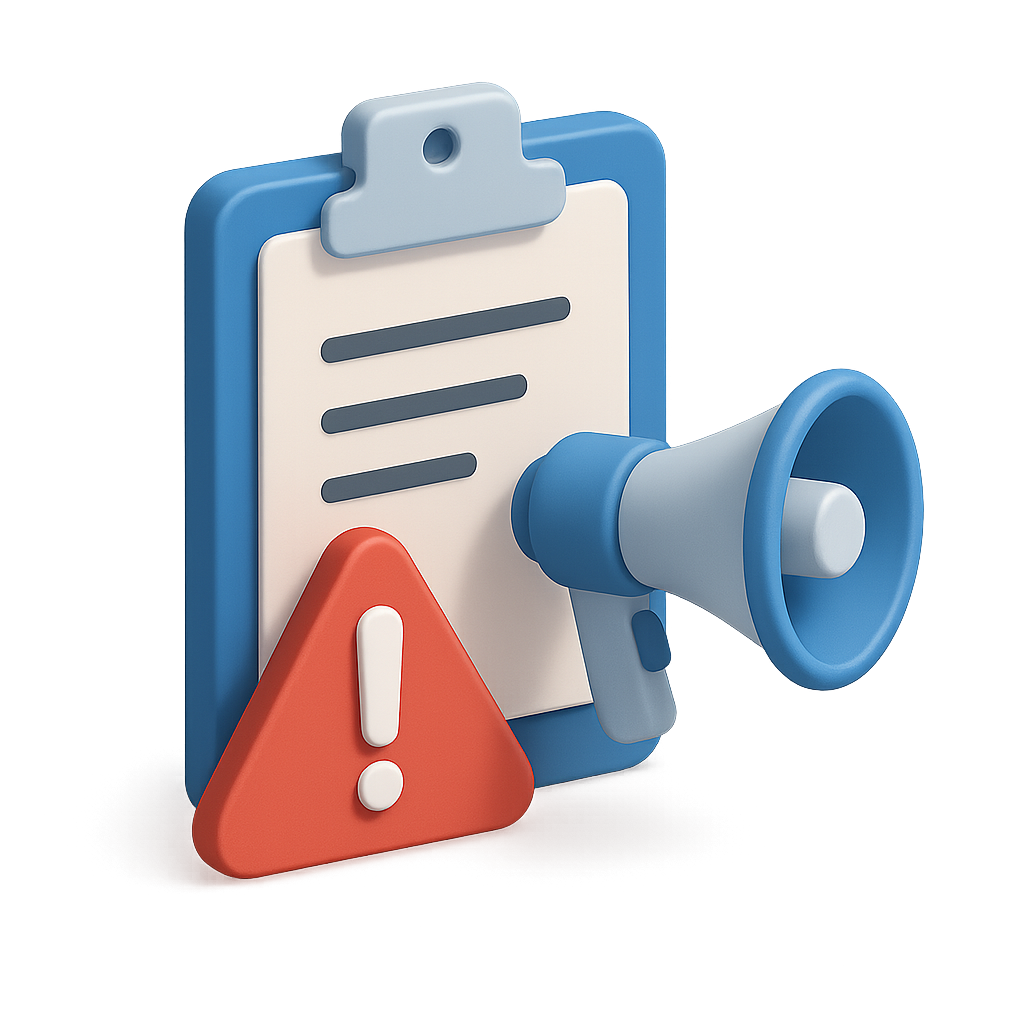 This 3D icon features a clipboard with a warning triangle and a megaphone, designed in a isometric view. The colors are vibrant, enhancing the 3D feel on a transparent background.