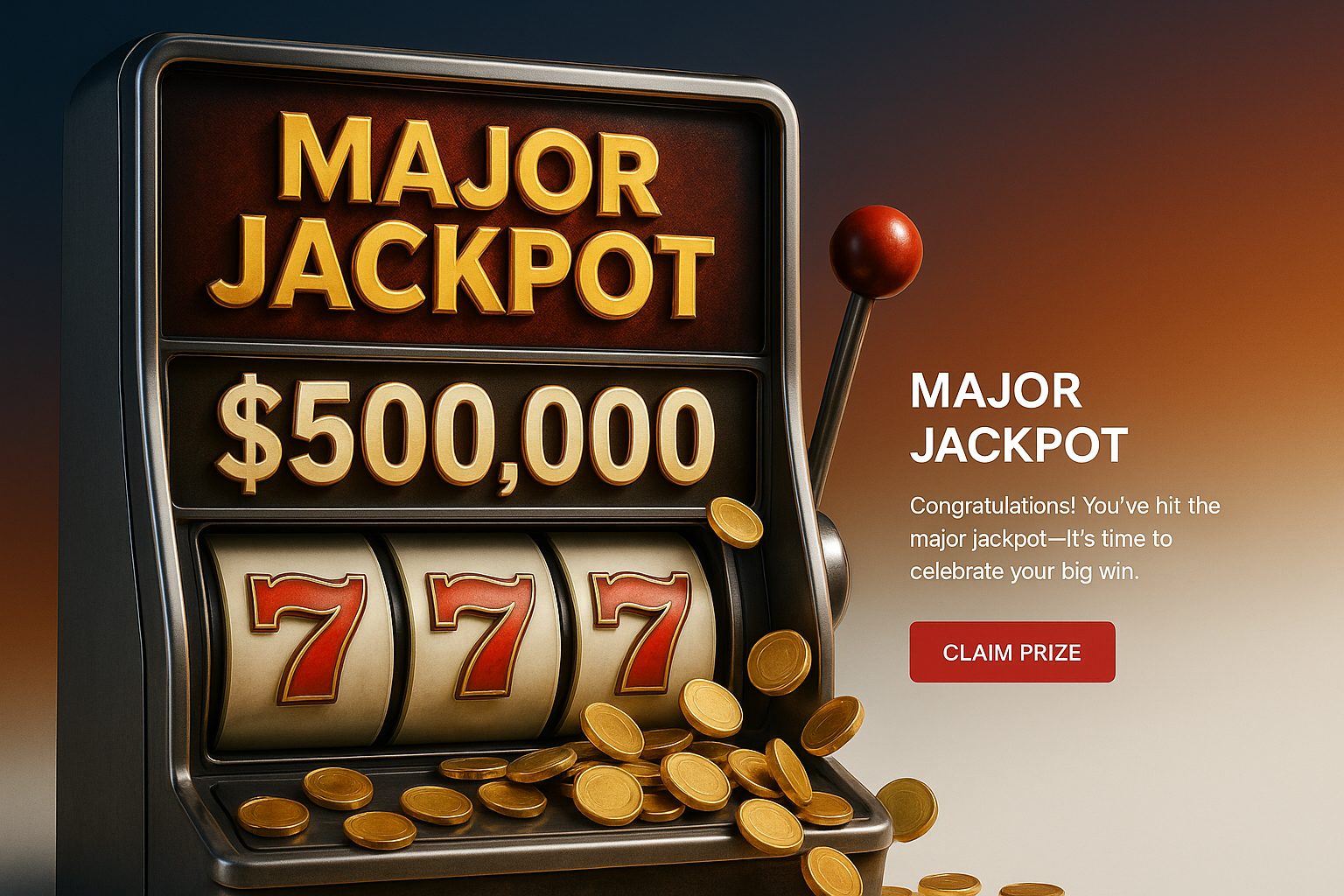A vibrant slot machine displaying a major jackpot win of $500,000. The design features golden coins spilled around the machine and a celebratory message urging players to claim their prize.