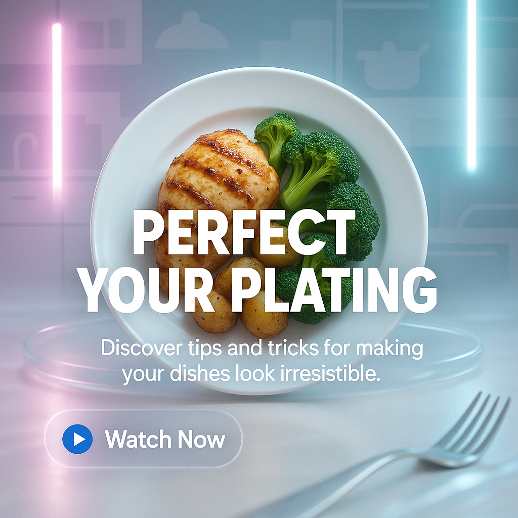 /Collection: /by davooda/Type: PNG/Engaging culinary tutorial graphic showcasing a beautifully plated dish, ideal for food enthusiasts. The modern design emphasizes plating tips and encourages viewers to watch.
