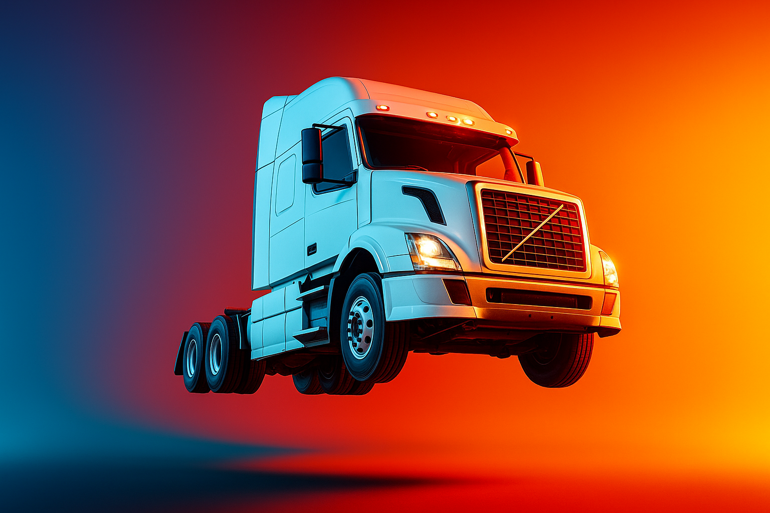 /Collection: /by davooda/Type: PNG/A realistic white truck is depicted in mid-air against a vibrant gradient background. The scene features contrasting lighting from both sides, enhancing the truck's details.