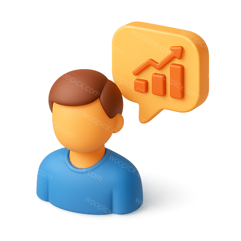 /Premium/Collection: /by davooda/Type: PNG/A stylized 3D icon featuring a person in a blue shirt with a speech bubble displaying an upward graph. The design has a transparent background and showcases a three-quarter isometric view.