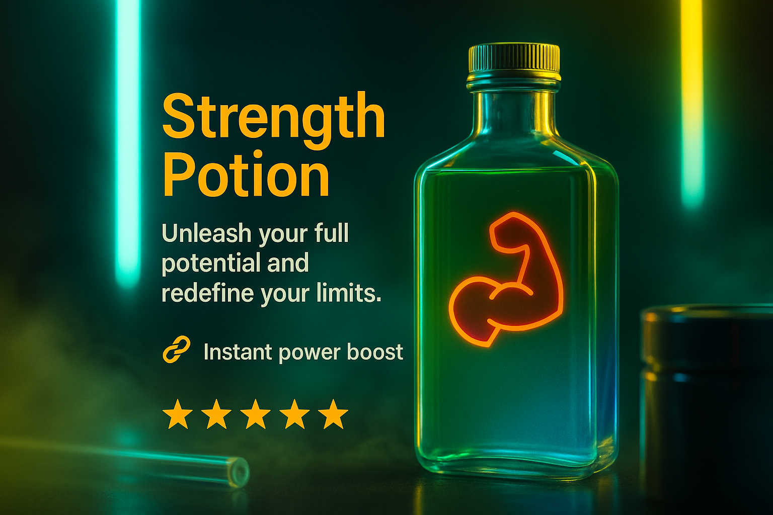 A visually captivating design for a strength potion, featuring a glowing bottle with a muscle icon, vibrant neon accents, and a compelling call-to-action.