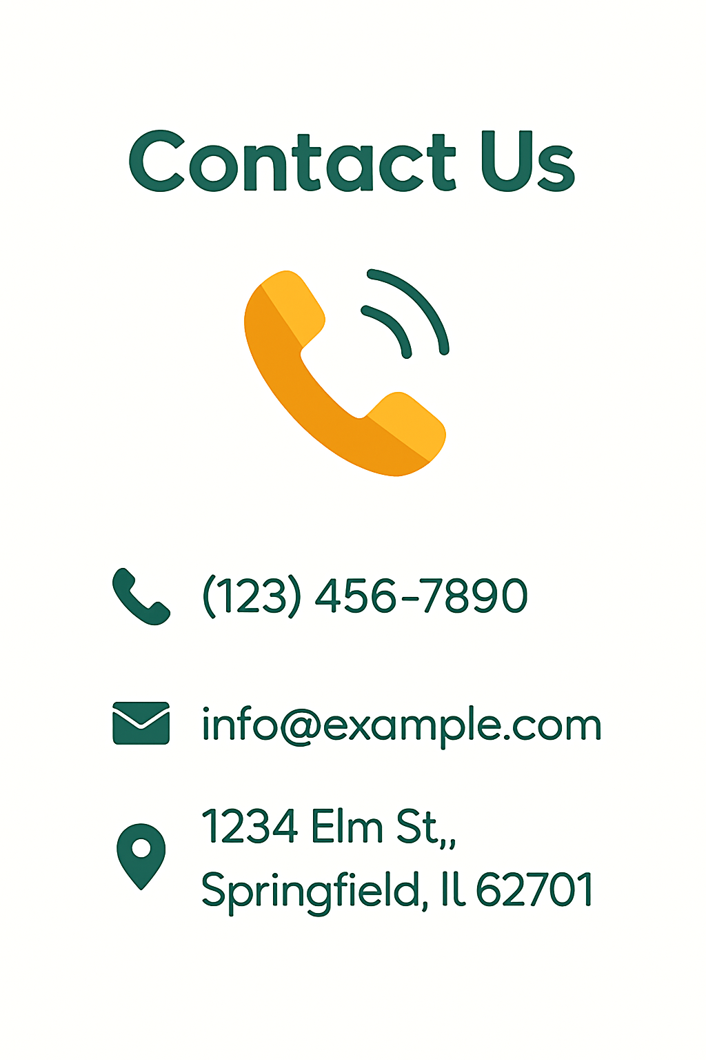 Simple and modern contact information graphic featuring a phone icon, email, and address layout, ideal for business communication or website use.