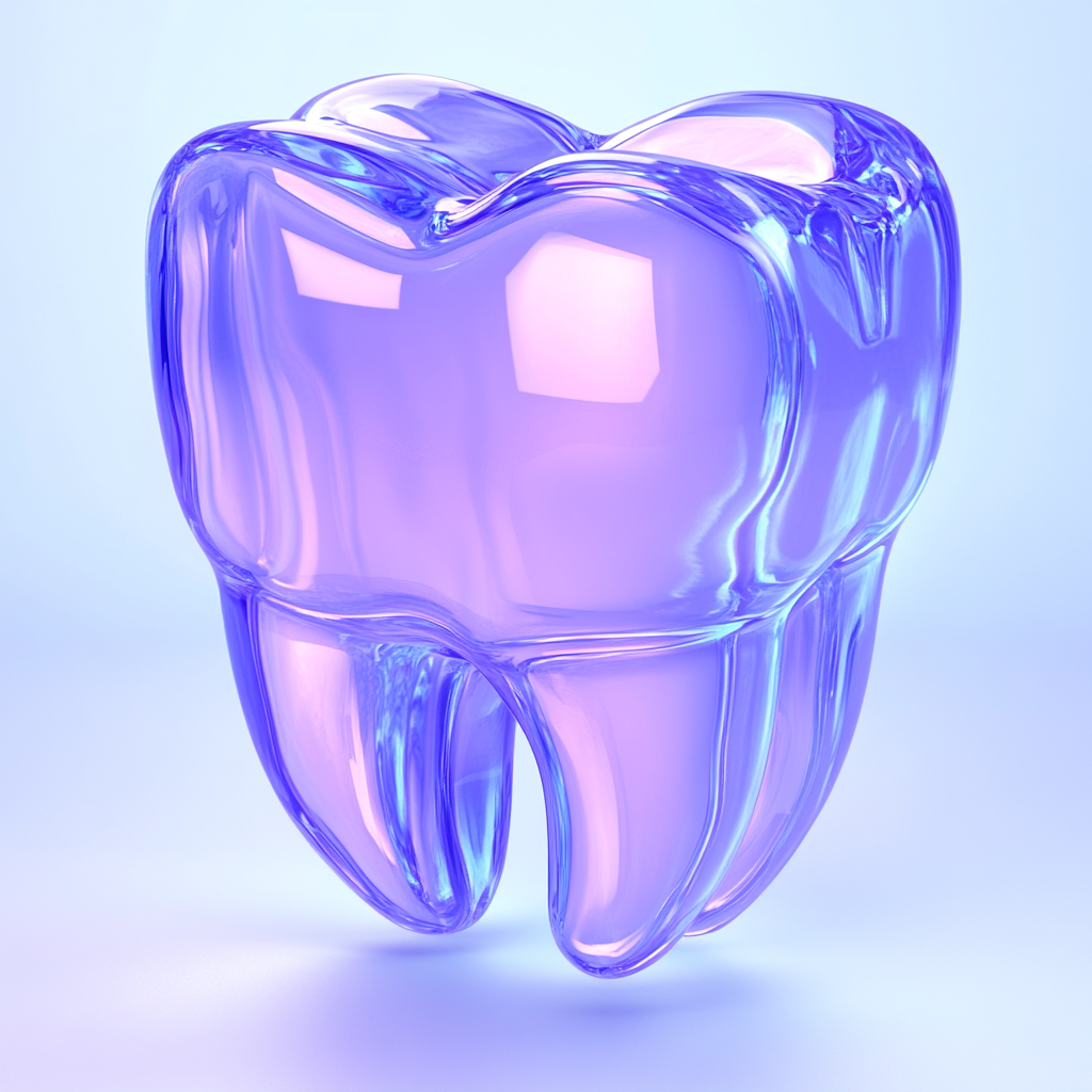 A creative 3D illustration of a tooth rendered in a glossy, translucent style with a vibrant purple hue. Ideal for dental health promotions or educational materials.