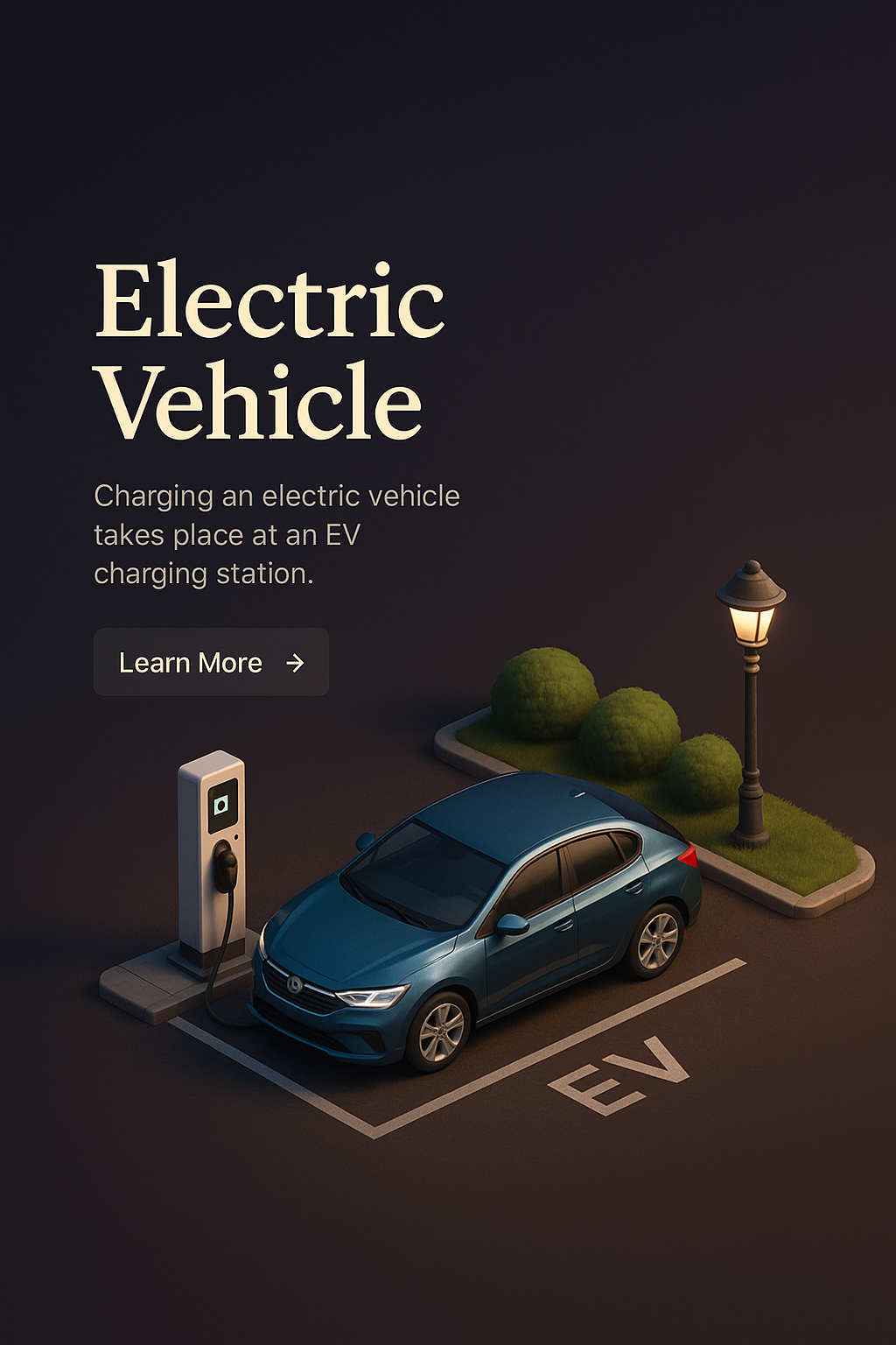 /Collection: /by davooda/Type: PNG/A detailed 3D illustration of an electric vehicle charging at a station, set against a dark gradient background. The scene captures the vehicle and its surroundings, highlighting realism and design.