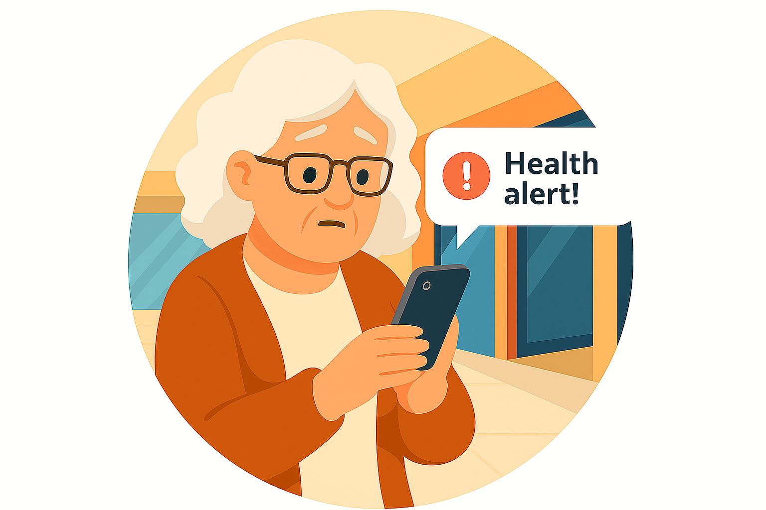 /Collection: /by davooda/Type: PNG/A digital illustration depicting an elderly person looking concerned while checking a smartphone for health alerts. This graphic is suited for health awareness campaigns targeting seniors.