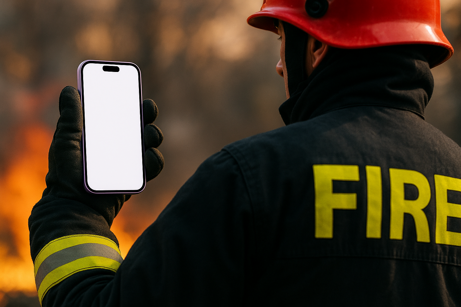 A firefighter in uniform holds a purple phone with a blank screen. The scene captures a dynamic moment, emphasizing the firefighter's role amidst a smoky backdrop, without showing their face.