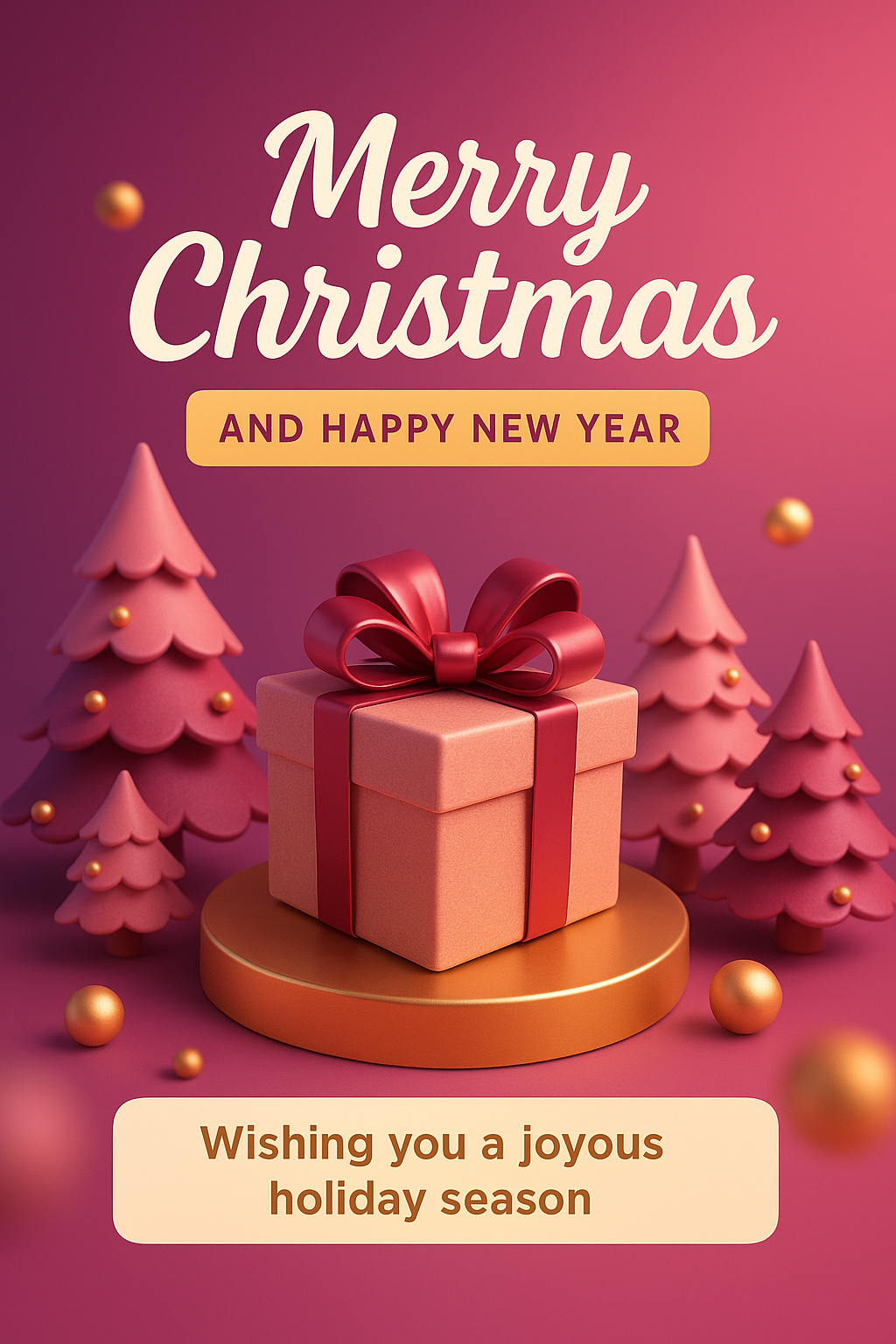 Vibrant holiday greeting card design featuring a 3D gift box and Christmas trees, perfect for seasonal celebrations and greetings.